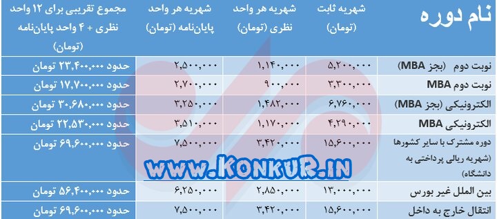 الکترونیکی MBA: شهریه ثابت ۴۲.۹ میلیون ریال و شهریه هر واحد نظری، عملی و پایاننامه به ترتیب ۱۱.۷، ۱۱.۷ و ۳۵.۱ میلیون ریال تعیین شده است.