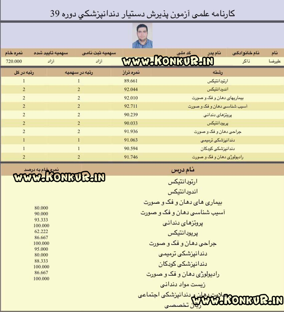 کارنامه آزمون دستیاری دندانپزشکی سال 1404 – رتبه کل 1 و نمره خام 720